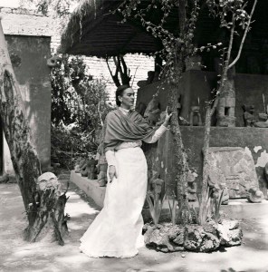 Frida posa fumando en el exterior, junto a la pirámide de figuras prehispánicas que coleccionaba.